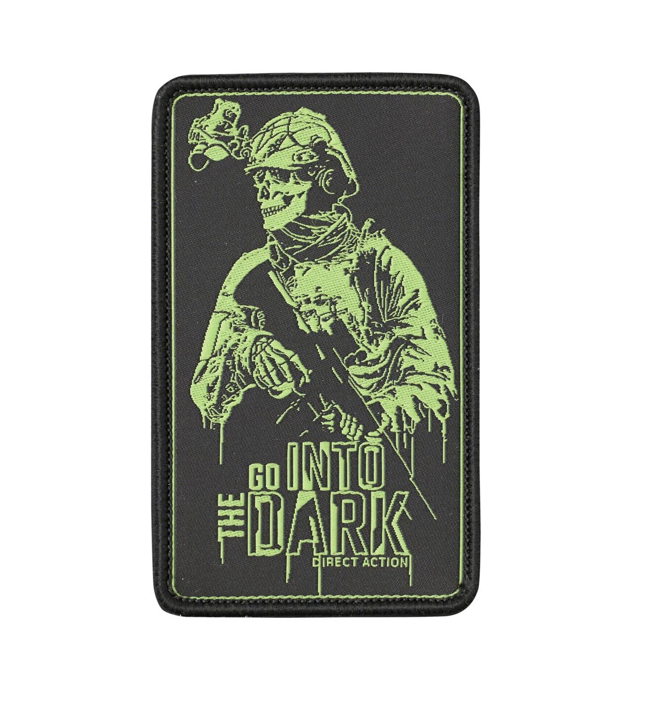 Patch brodat cu un schelet în stil militar, pe fundal negru, cu cusături dese care întăresc marginile. Patch-ul este prevăzut și cu Velcro pentru atașare pe echipament sau îmbrăcăminte.